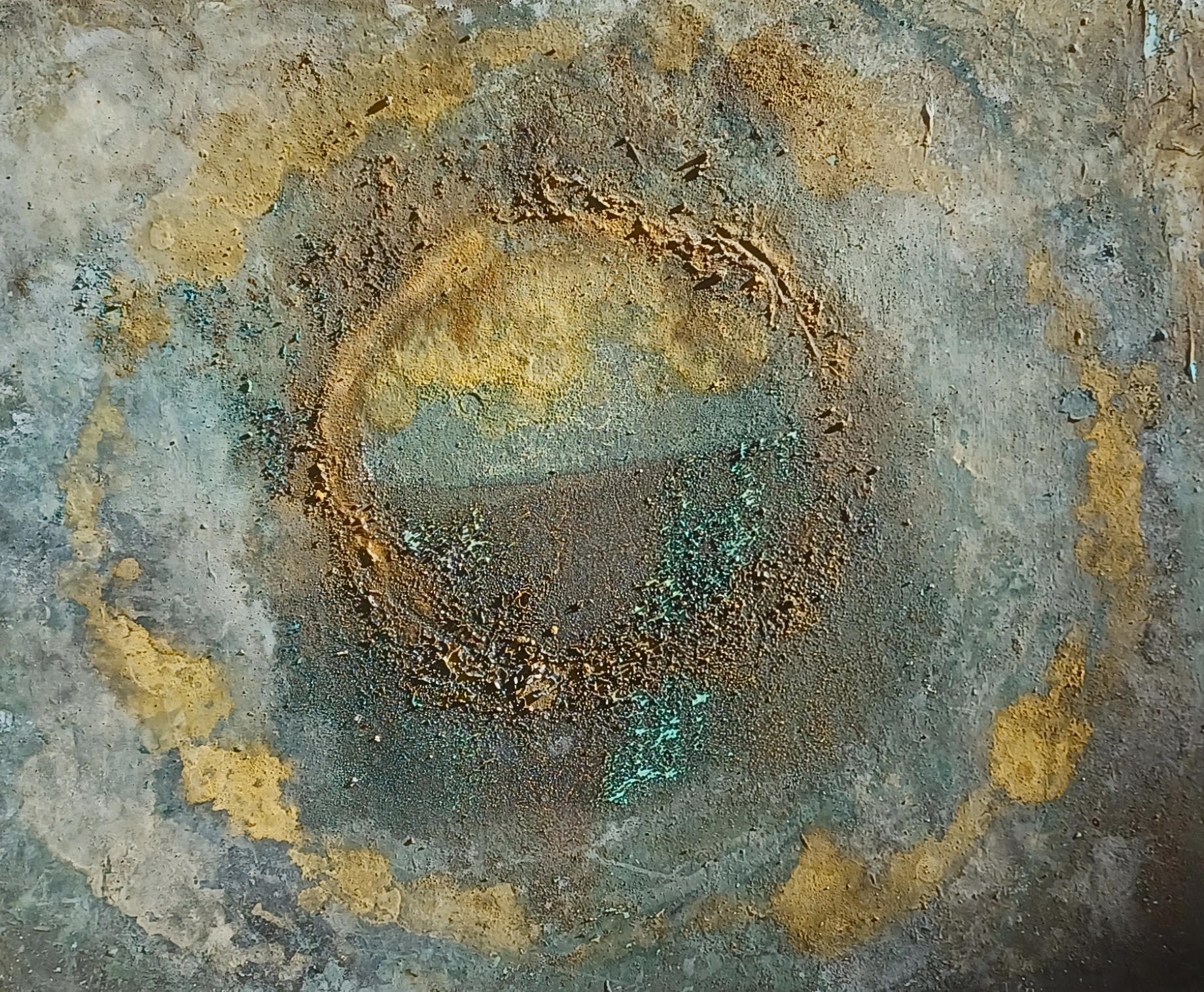 Sviluppo tecniche originali, nate da una sperimentazione costante. Con il Reverse on Glass, integro elementi naturali tra vetro e colla vinilica, generando composizioni sospese tra trasparenza e blocco. Uso la gomma lacca in modo completamente personale, sovvertendone l’uso tradizionale per ottenere superfici vibranti, epidermiche.