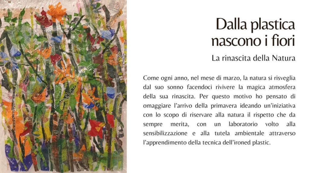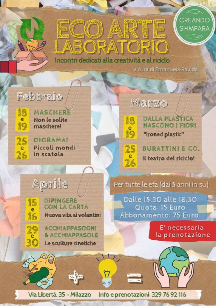 Laboratori di Arte Sostenibile La creatività intesa come strumento per la tutela ambientale Laboratori in corso: Calendario 2023 degli incontri di Eco Arte presso il centro culturale “Creando si Impara” di Milazzo Laboratori svolti: Calendario 2022 degli incontri di Eco Arte presso il centro culturale “Creando si Impara” di Milazzo Presentazione degli incontri di Eco Arte svolti nel centro culturale”Creando si Impara” di Milazzo