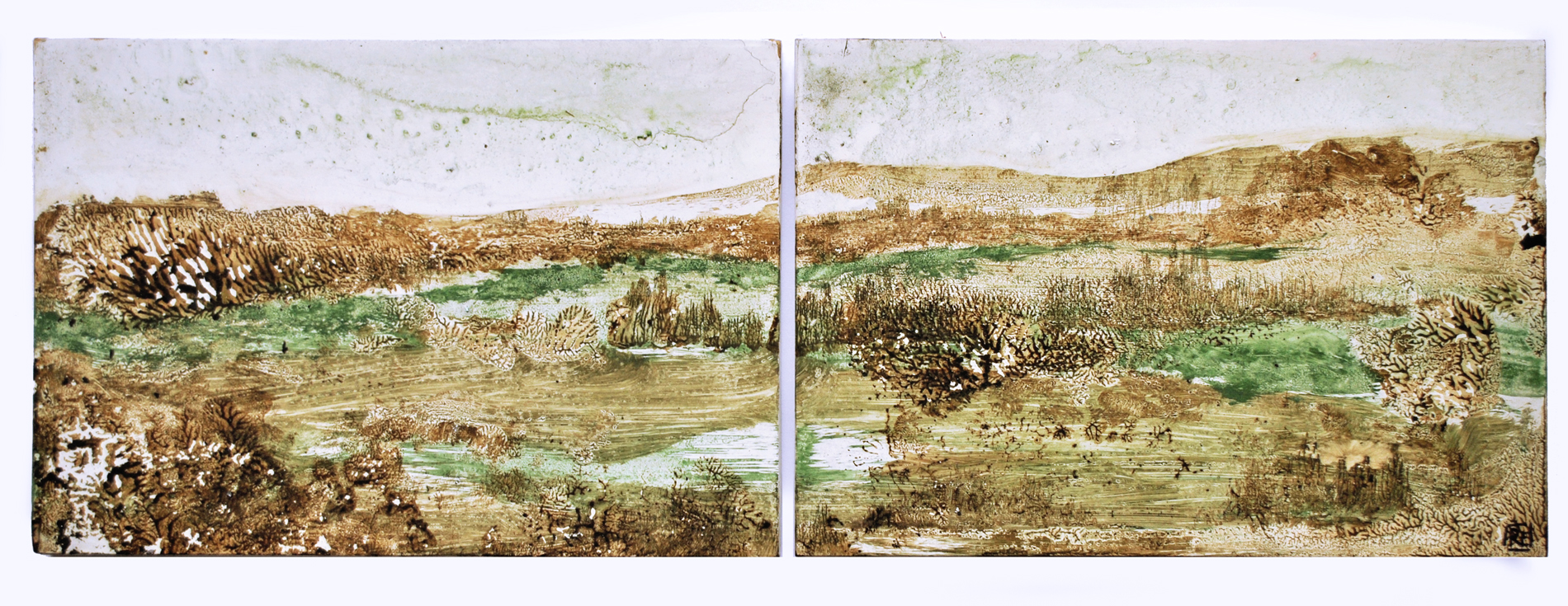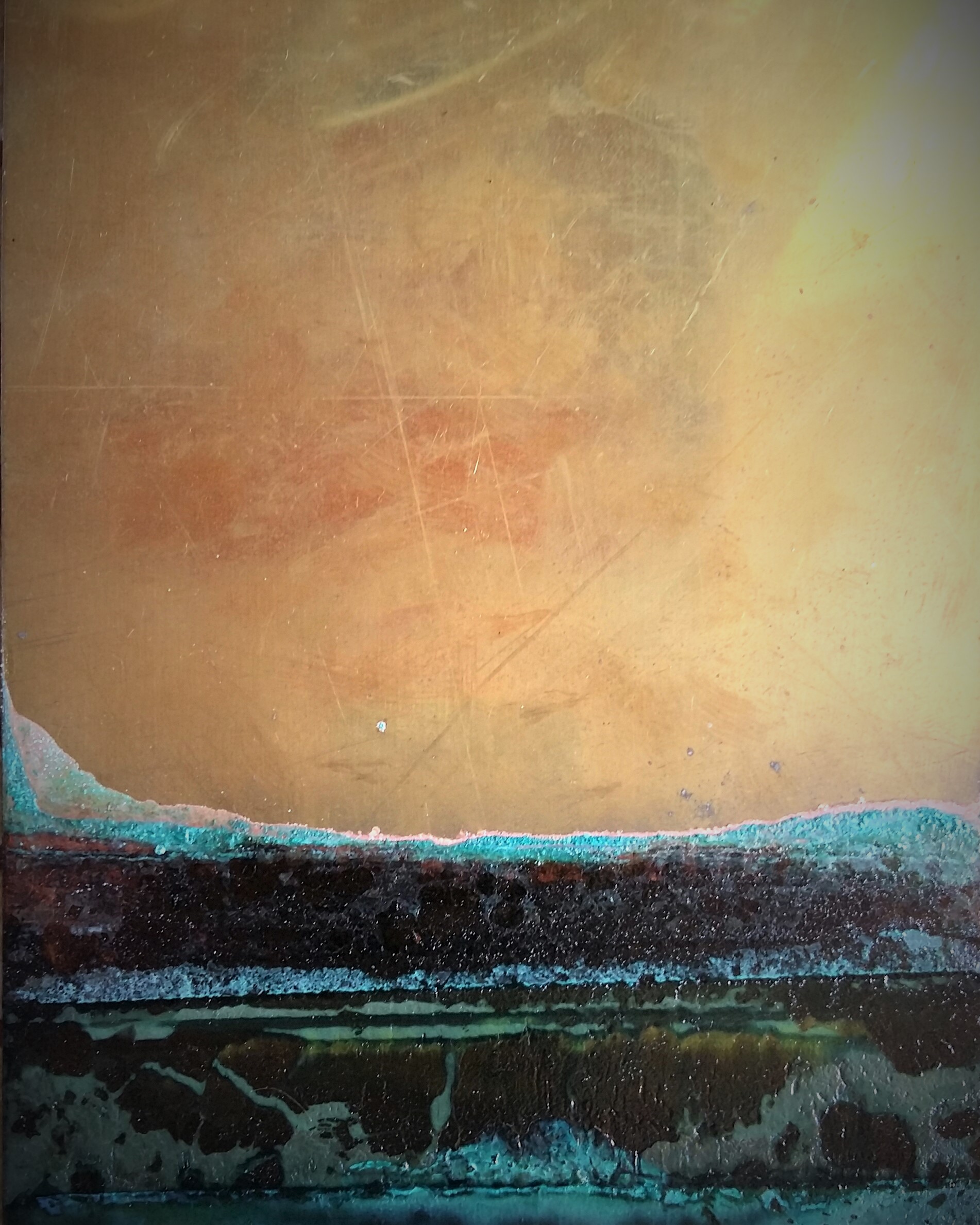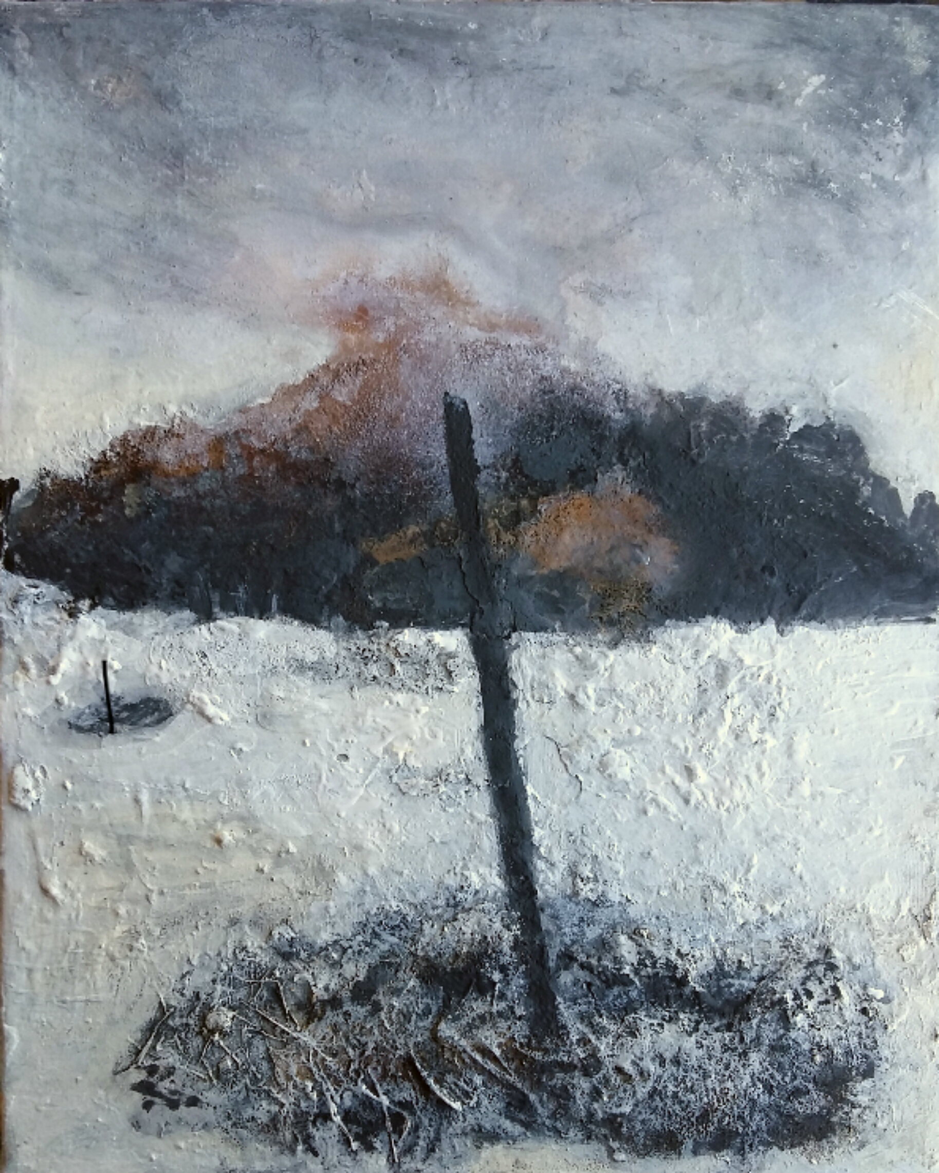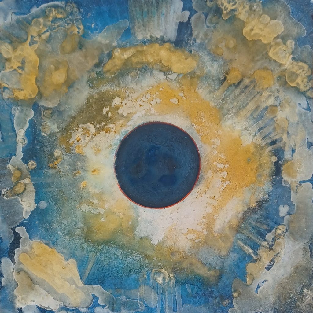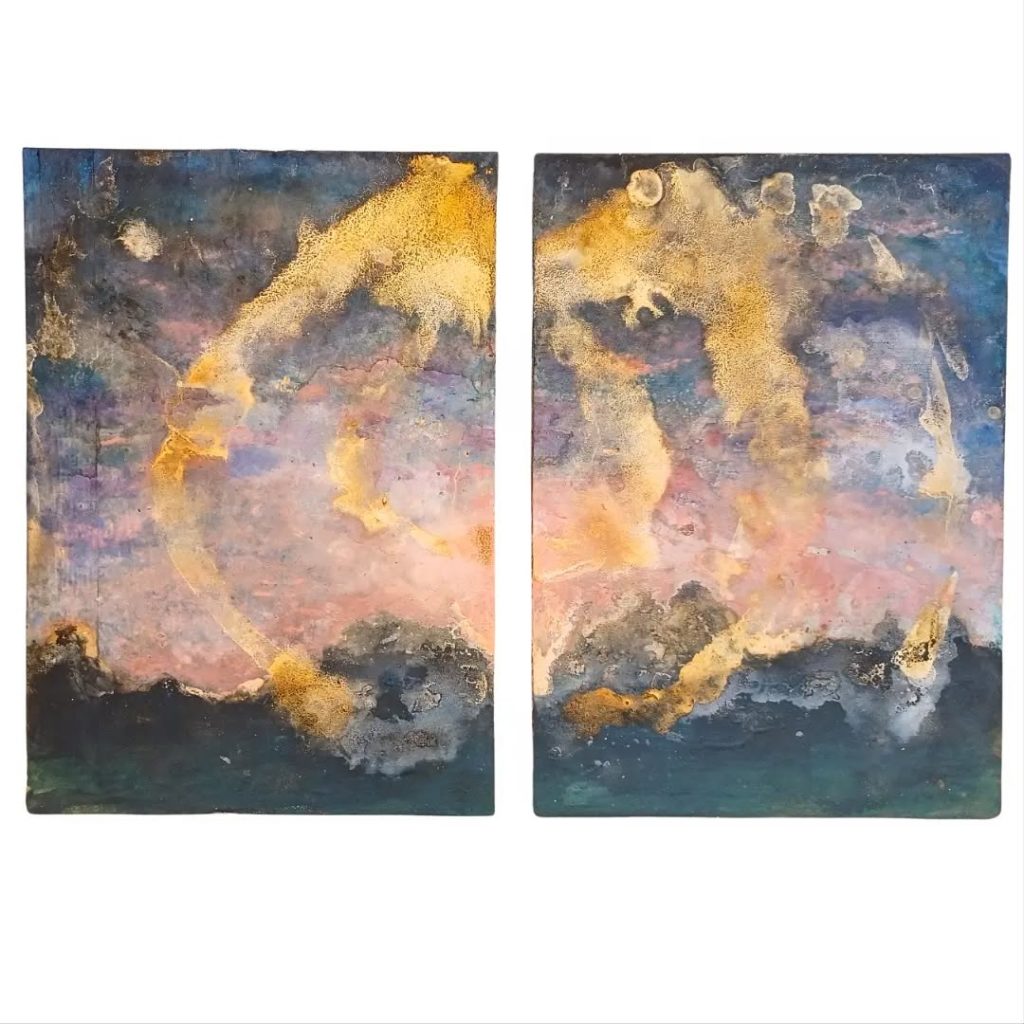 Rivolsi lo sguardo al mistero senza la presunzione di comprenderlo | mixed media and shellac on wood Grande Etna | side AGrande Etna | side BDie Sonne | mixed media | cm 83 x 101Dietro, il sole | mixed media and shellac on wood