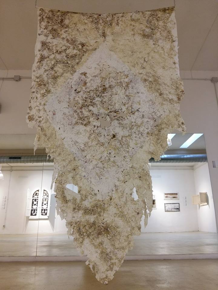 La scena  è nettamente dominata dall’ultima creazione di RE che pende dai soffitti chiari della sala centrale: ispirandosi all’antica tradizione degli arazzi, l’artista ne ha realizzato una sua originale versione. Un tappeto floreale nascosto in un mare di colla vinilica che cade dal cielo e silenziosamente catalizza l’attenzione di tutti. Tra gli infiniti petali e pezzi di bijoux nascosti nella trama l’occhio si perde fino a sbucare nei pochi punti lasciati volutamente aperti per riflettersi nello specchio sulla parete opposta: di chi sono ora gli occhi che guardano?