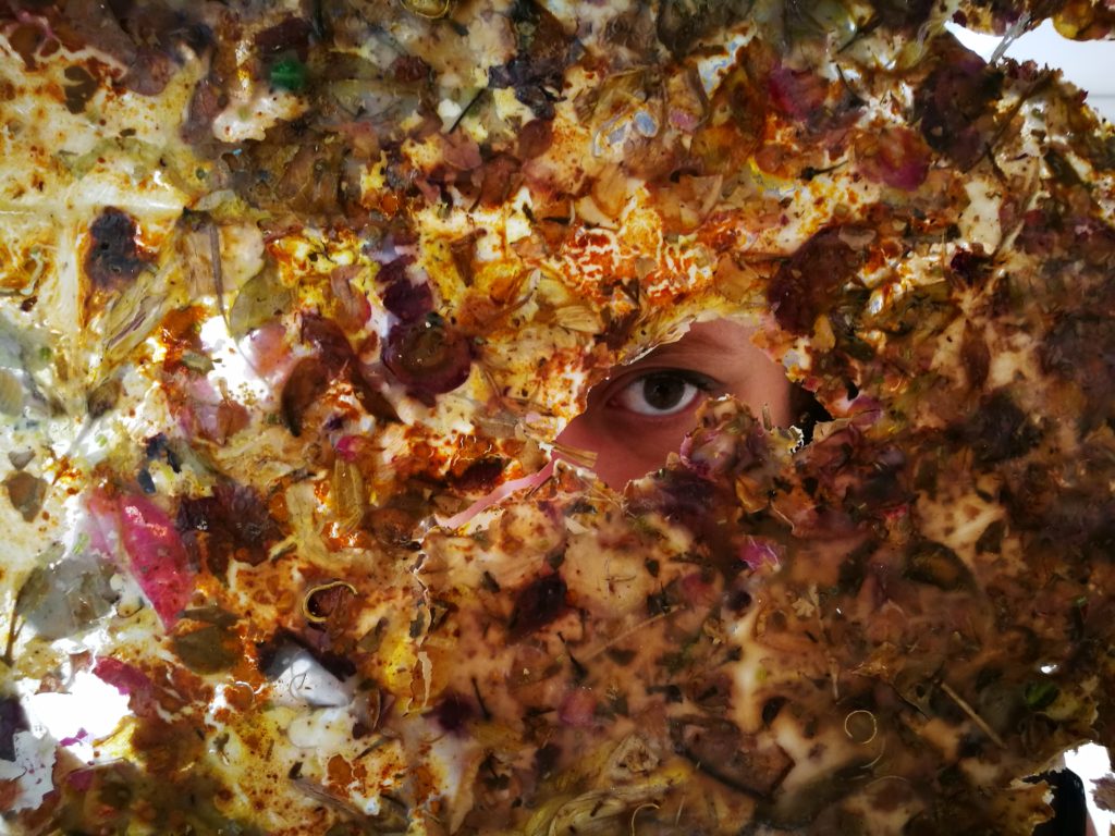 Foglie, fiori, bigiotteria, curcuma, curry, idropittura e colla vinilica